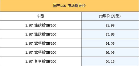 9月27日,長安標(biāo)致雪鐵龍國產(chǎn)新DS5正式上市銷售,相比在售進(jìn)口版車型,該車增加了1.6T高功率版新車。該新車本次共推出了1.6升排量的5款車型,售價區(qū)間為21.99萬-30.19萬,各車型具體售價如下表所示: